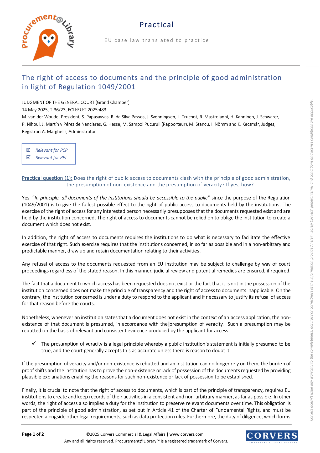 Il documento riassume in chiave pratica una sentenza del Tribunale dell’Unione Europea (T-36/23 del 14 maggio 2025), riguardante il diritto di accesso ai documenti secondo il Regolamento (CE) n. 1049/2001 e il principio di buona amministrazione. Viene analizzato come questi diritti si rapportino con le presunzioni di inesistenza e veridicità dei documenti da parte delle istituzioni europee. Il testo sottolinea l’obbligo per le istituzioni di conservare in modo coerente e trasparente tutte le comunicazioni rilevanti, incluse quelle informali come i messaggi di testo. Il documento è particolarmente rilevante per le amministrazioni pubbliche impegnate in appalti pre-commerciali (PCP) e appalti pubblici per l’innovazione (PPI), poiché evidenzia la necessità di sistemi robusti di gestione e archiviazione dei documenti, nonché l’obbligo di fornire motivazioni chiare in caso di rifiuto all’accesso.